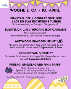 Im Offenen Treff könnt Ihr, Dienstag bis Freitag von 15 bis 19Uhr, bei uns im Cafébereich abhängen, Brettspiele zocken, Kickern, Billard, Playstation 5 und Tischtennis spielen.